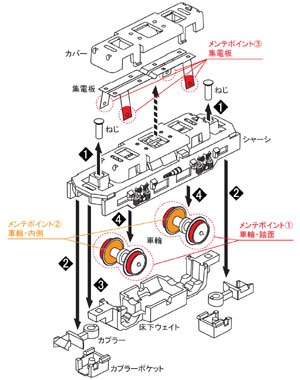 C上記と逆の順番で、各パーツを組立てる(集電板が車輪の内側になるように注意して戻してください)。 |